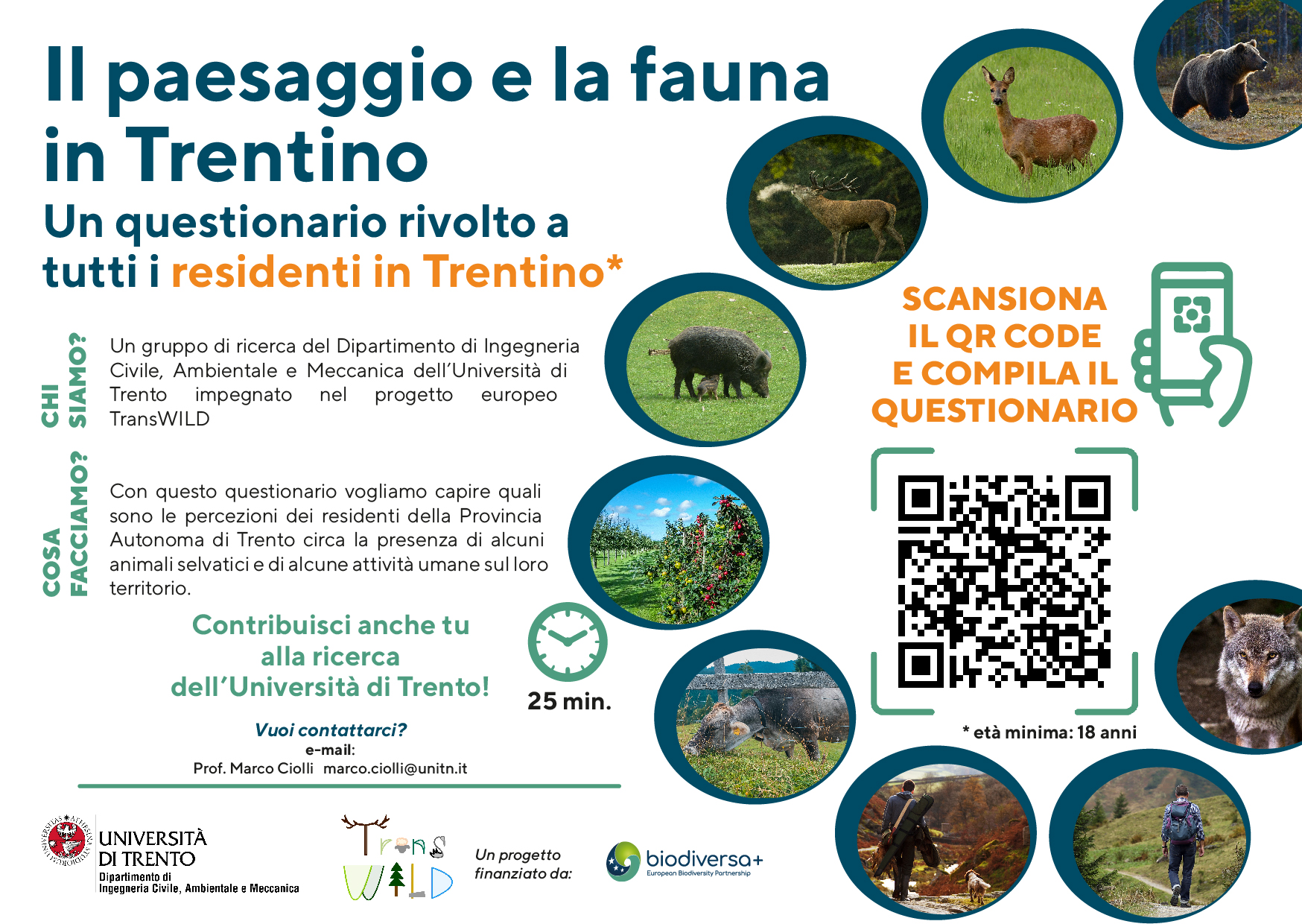 TransWILD è un progetto triennale il cui obiettivo è studiare l'interazione tra esseri umani e fauna selvatica. Nell'ambito di questo progetto vorremmo capire come gli abitanti del Trentino percepiscono la fauna selvatica (capriolo, cervo, lupo, cinghiale, orso) e alcune attività umane nel paesaggio che li circonda.